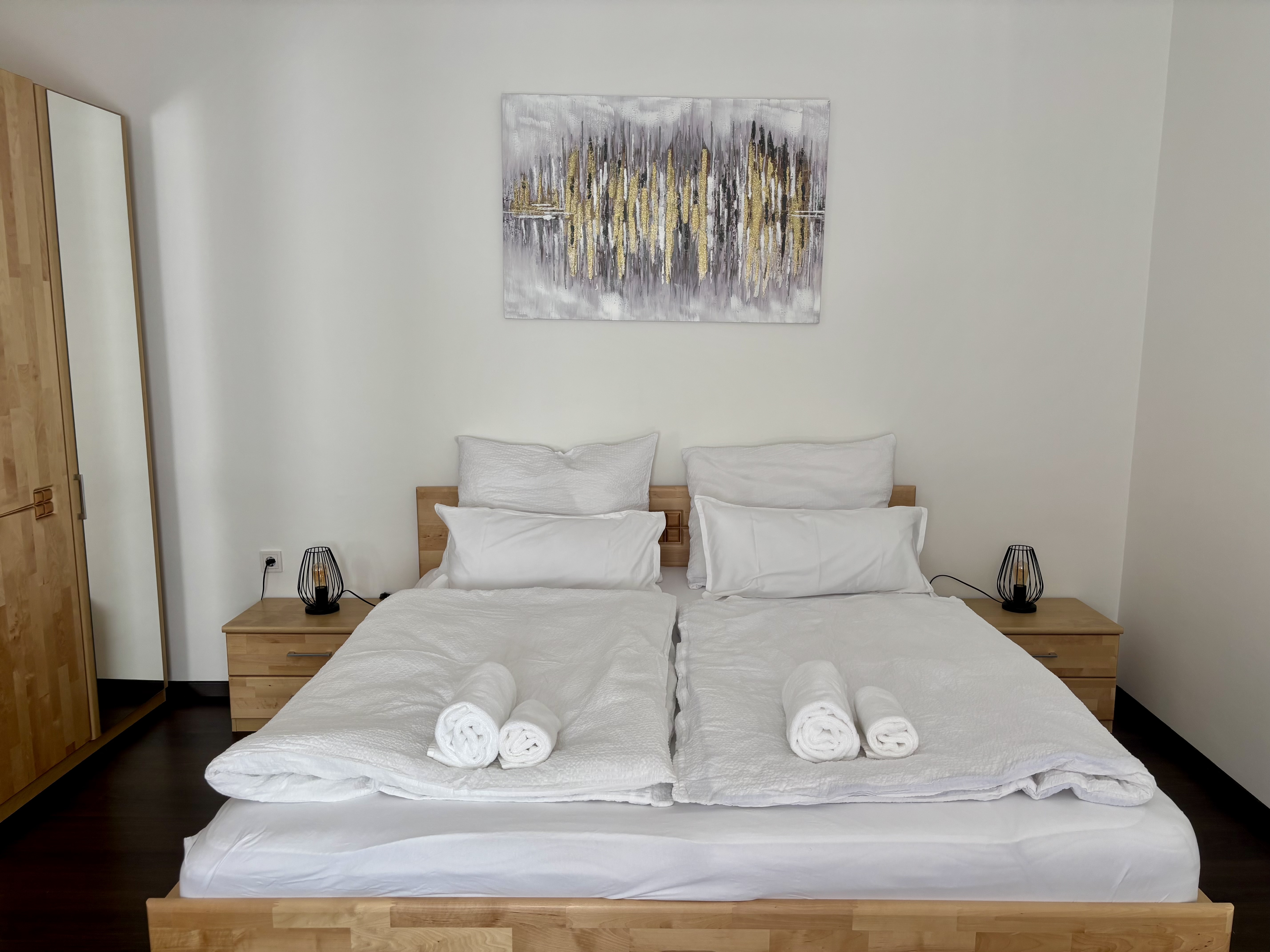 • Zwei geräumige Schlafzimmer für 4+1 Personen mit 2 großen Doppelbetten, Schlafsofa, Flachbildfernseher, Schreibtisch und Sofa, Klimaanlage;