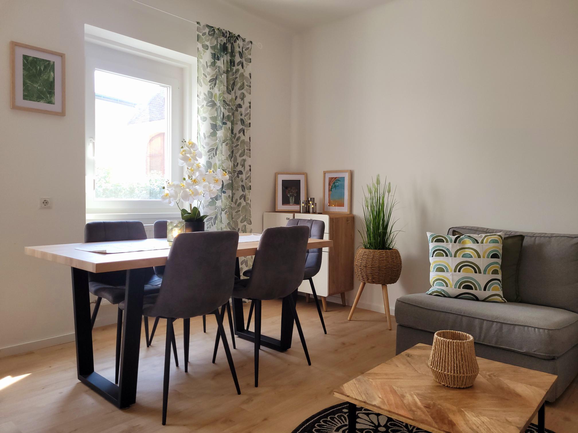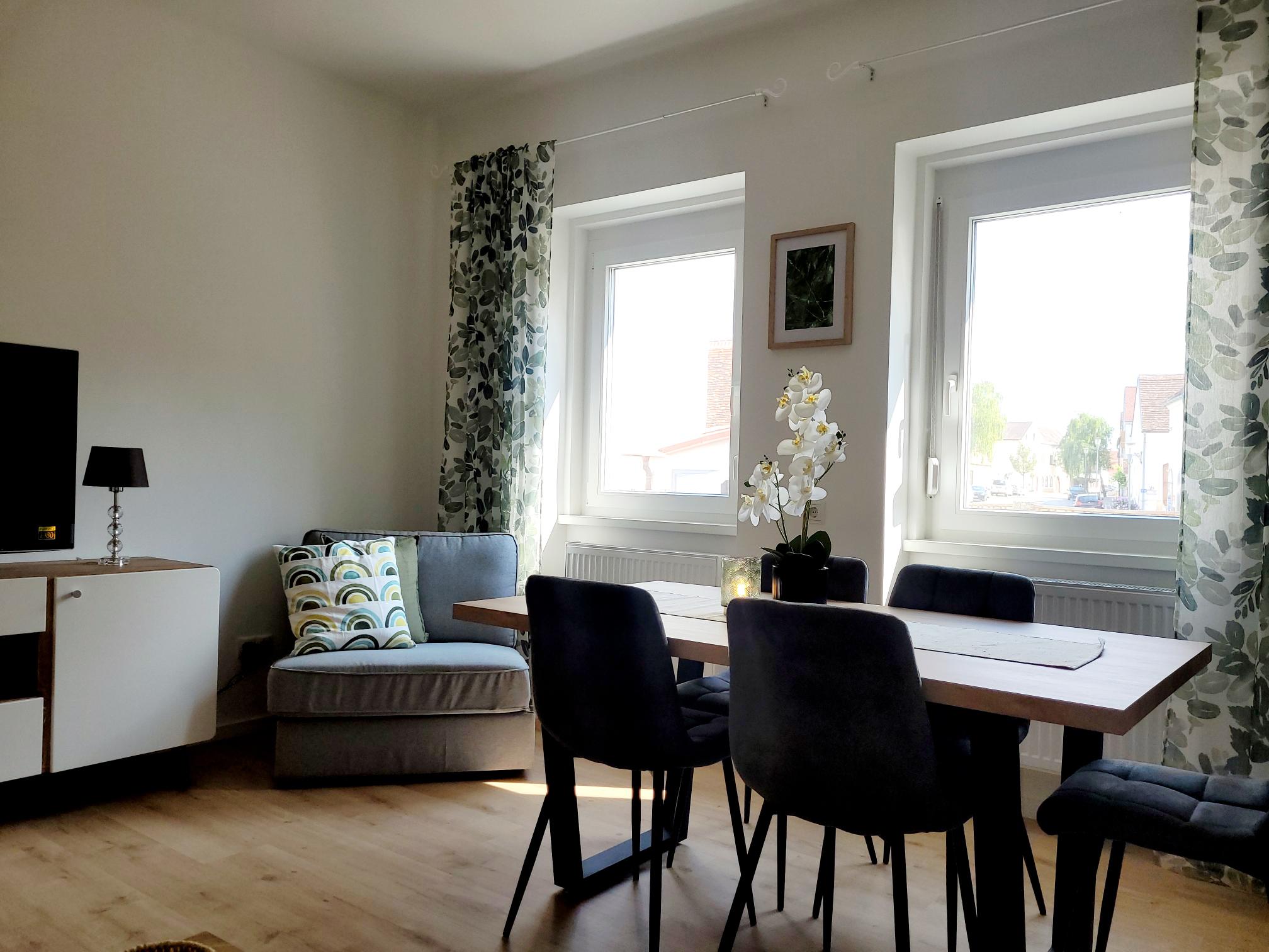 Im ansprechend gestalteten Wohnbereich können Sie auf der gemütlichen Couch und den bequemen Sesseln gemeinsamen Verweilen (z.B. beim Fernsehen via Sky TV). Der große Esstisch bietet Platz für bis zu sechs Personen. Für Familien oder Gruppen können die Sitzgelegenheiten zu gemütlichen Betten für bis zu vier Personen umgestaltet werden.