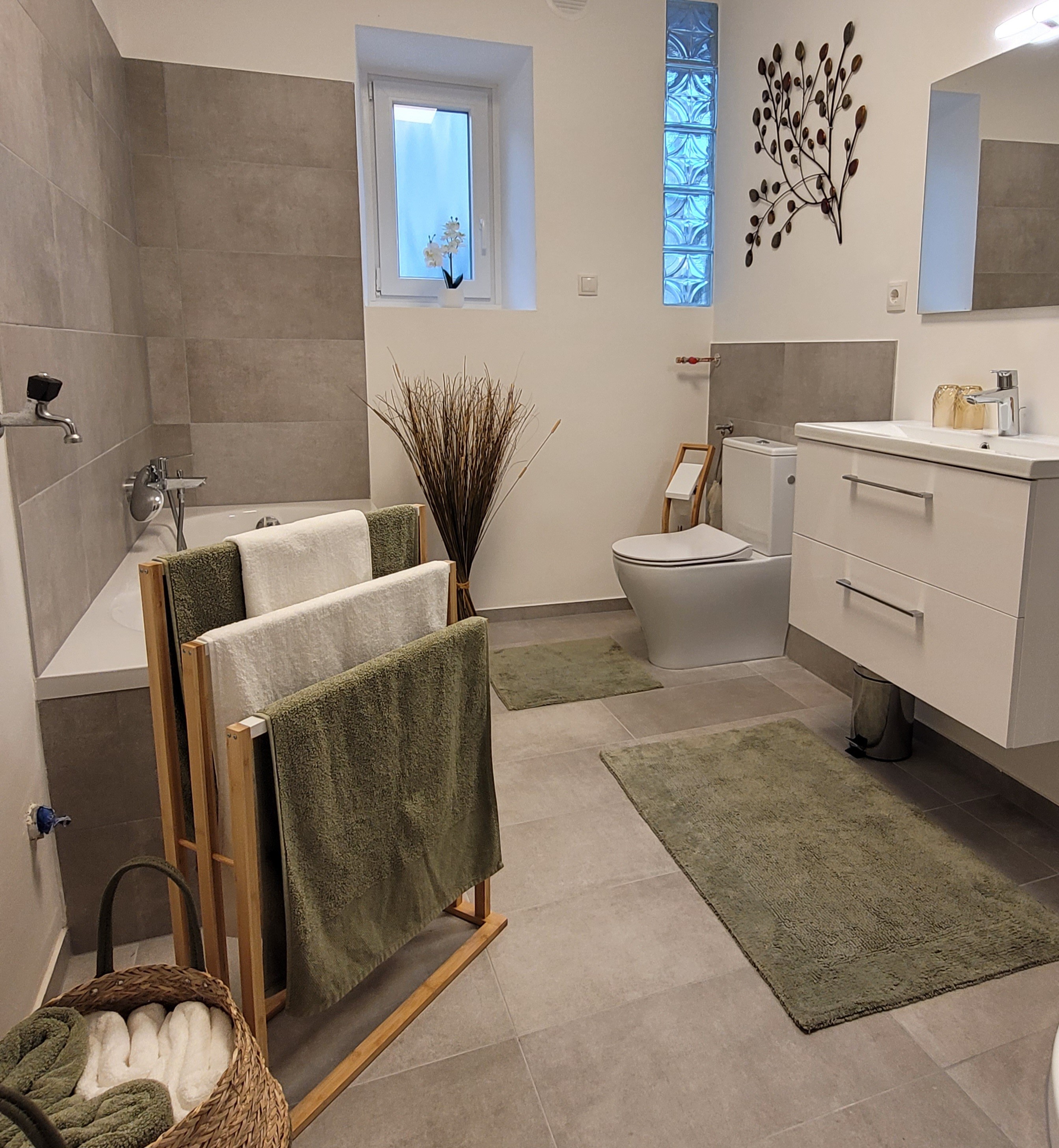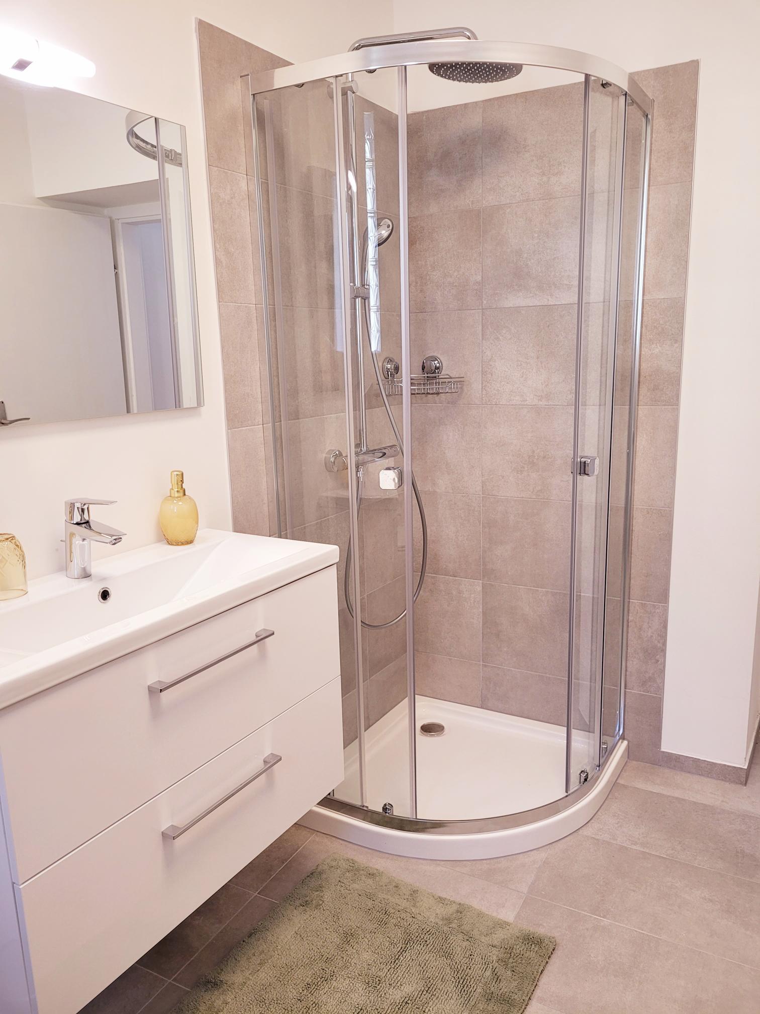 Das moderne Bad mit WC verfügt über Dusche, Badewanne und ein großes Waschbecken mit Spiegel. Überdies steht Ihnen eine Waschmaschine zur Verfügung.