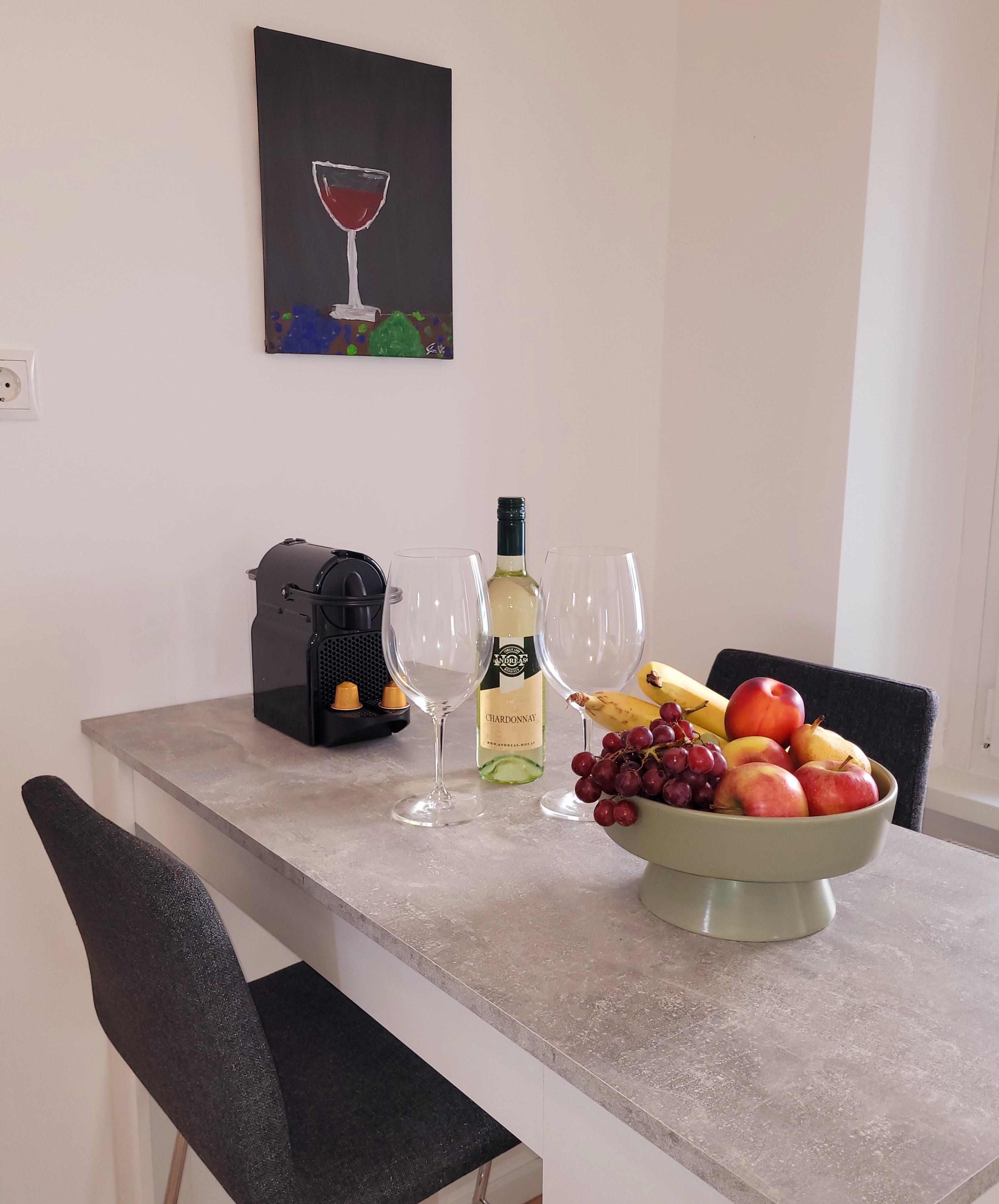 In der Küche sind Geschirrspüler, E-Herd, Backrohr, Kühlschrank, Kaffeemaschine und sonstige Grundausstattung zur Selbstversorgung vorhanden. Im Barbereich können Sie einen Snack oder hervorragenden Wein aus dem Burgenland genießen.