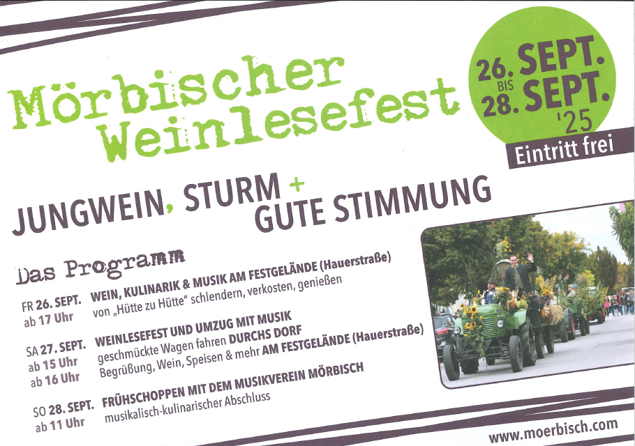 Die Weinlese ist vorbei, in den Kellern gärt der Wein und ein ganz eigener Duft steigt aus den Kellern der Mörbischer Winzer. Verkosten sie den frischen Sturm, der mit all seiner Kraft schon den herrlichen Geschmack des Weines erkennen lässt. Seien sie bei unserem Weinlesefestzug zu Gast und lassen sie sich zur Mörbischer Weinlesekönigin küren. Anschließend schlendern sie in der berühmten Hauerstraße von Stand zu Stand, verkosten hausgemachte burgenländische Schmankerl und genießen die Stimmung bei einem typisch burgenländischen Fest mit regionaler Blasmusik.